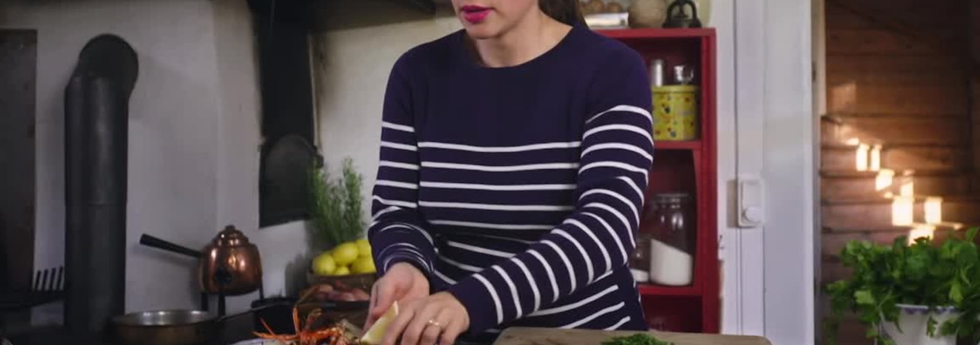 Rachel serves a grilled lobster with a cabbage and caraway salad. Then she makes her own gravlax poke bowl and for dessert she prepares white chocolate and berry coconut mountains.
