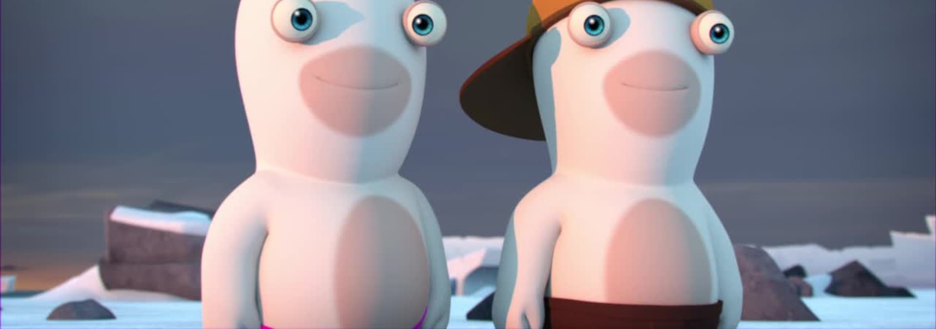 Following an unfortunate pass during a game of Rabbid hockey, Mini Rabbid accidentally swaps places with a baby penguin.