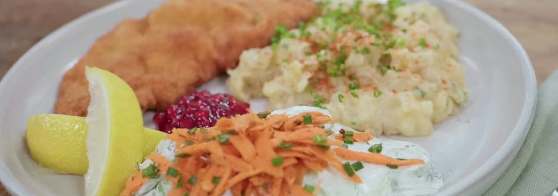 Join us and learn to cook German Pork Schnitzel, with two classic accompaniments, Croatian Mashed Potatoes and German Cucumber-Dill Salad.