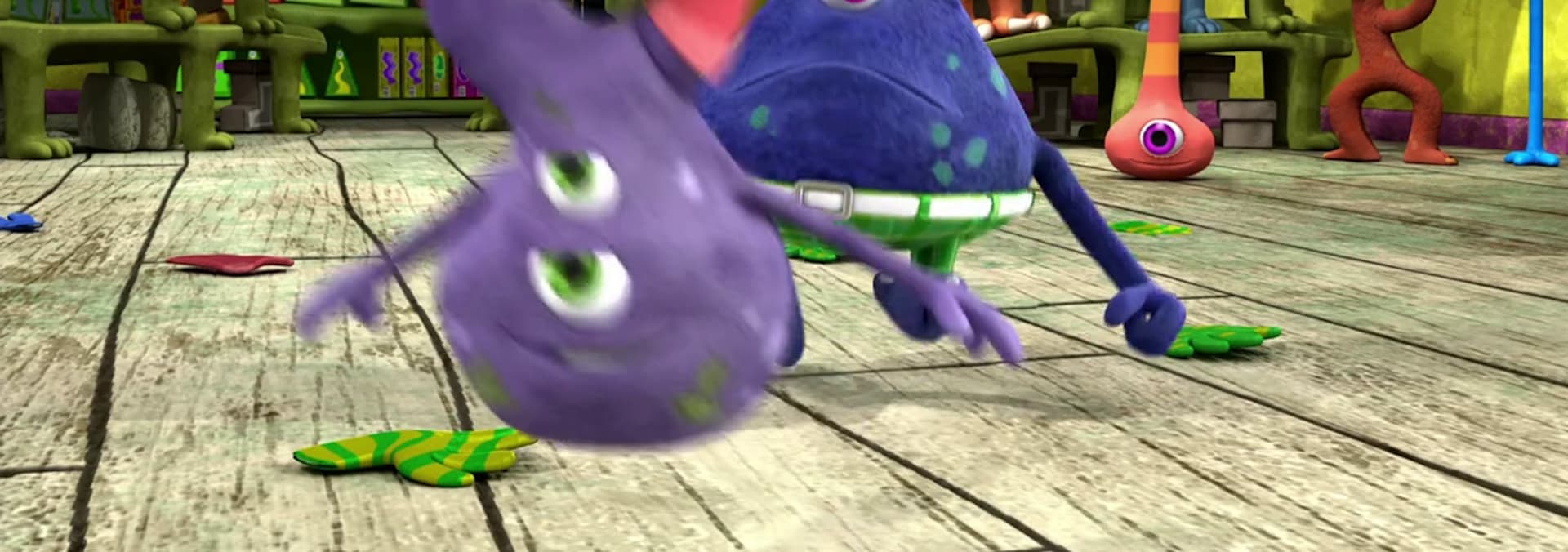 Mr. Cranky Pants Monster is crankier then ever! Mess Monster has been in Mr. Cranky Pants Monsters store and turned the place upside down! The call comes into the Monster Math Squad to help sort things out while Mr. Cranky Pants Monster chases away Mess Monster! At the store, the Squad learns all about PAIRS as they sort out the sock supply and then head out to match up the Horned Hoots and get them back into their cages.