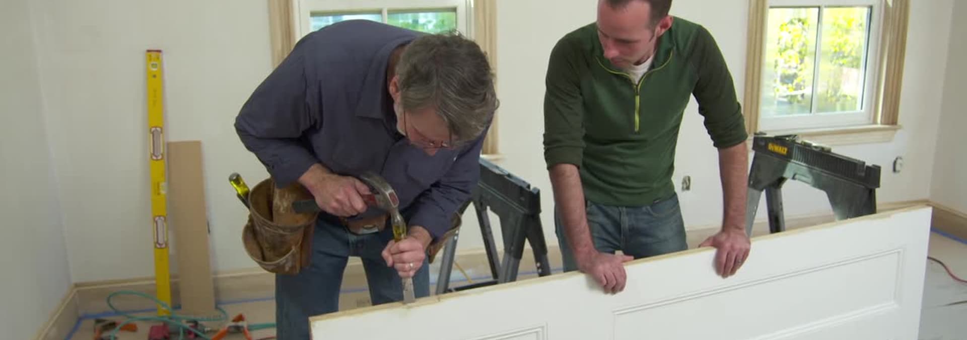 Tom's crew and intern install a beam to support a new opening to the kitchen. The homeowners start making decisions with their interior select finishes with their interior designer. Three apprentices arrive, build the essentials and get new tool belts. Their first job is to tackle the front porch.