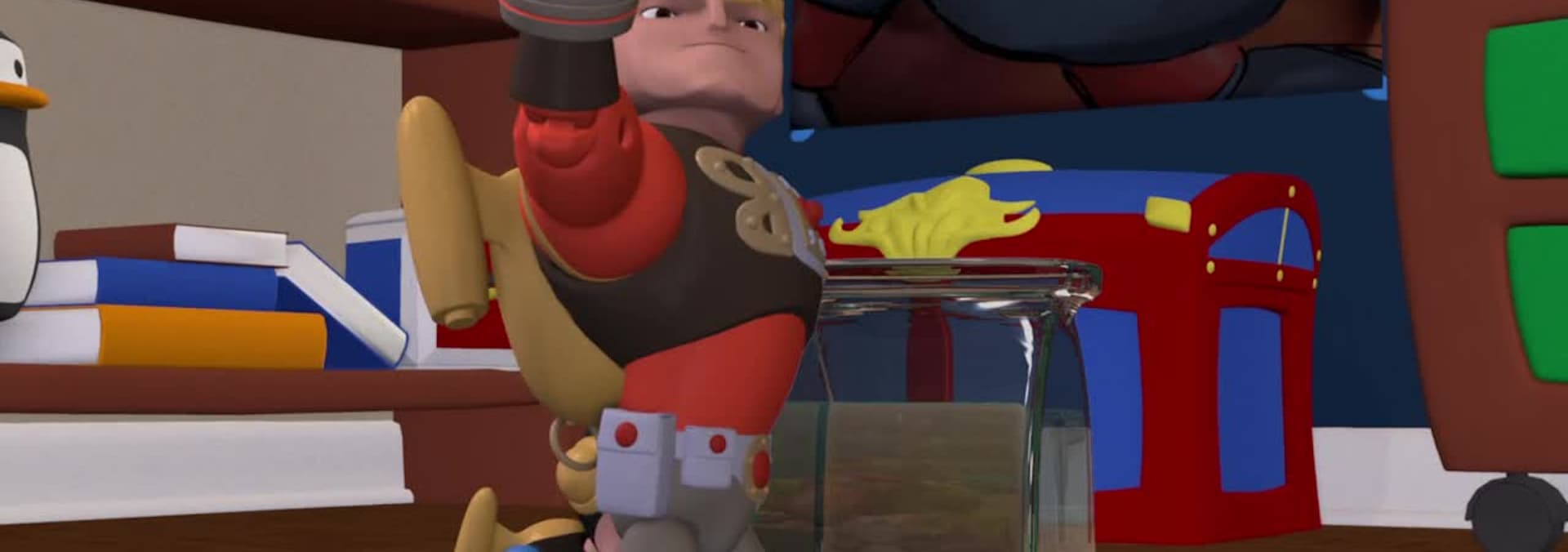 Jerry had promised to make a party hat for Nicole but forgot and now realizes he is running out of time. The Raiders decide to give him a hand by stopping time. They sneak down to mom’s special Grandfather clock in the hallway. But when Bakko gets locked inside, swinging dizzily on the pendulum, Jerry must stop work on the hat and figure out how to get Gant inside the clock in a huge rescue operation. By the time Mom and Nicole appear with a cookie party hat, Jerry has saved the day and mom’s clock.