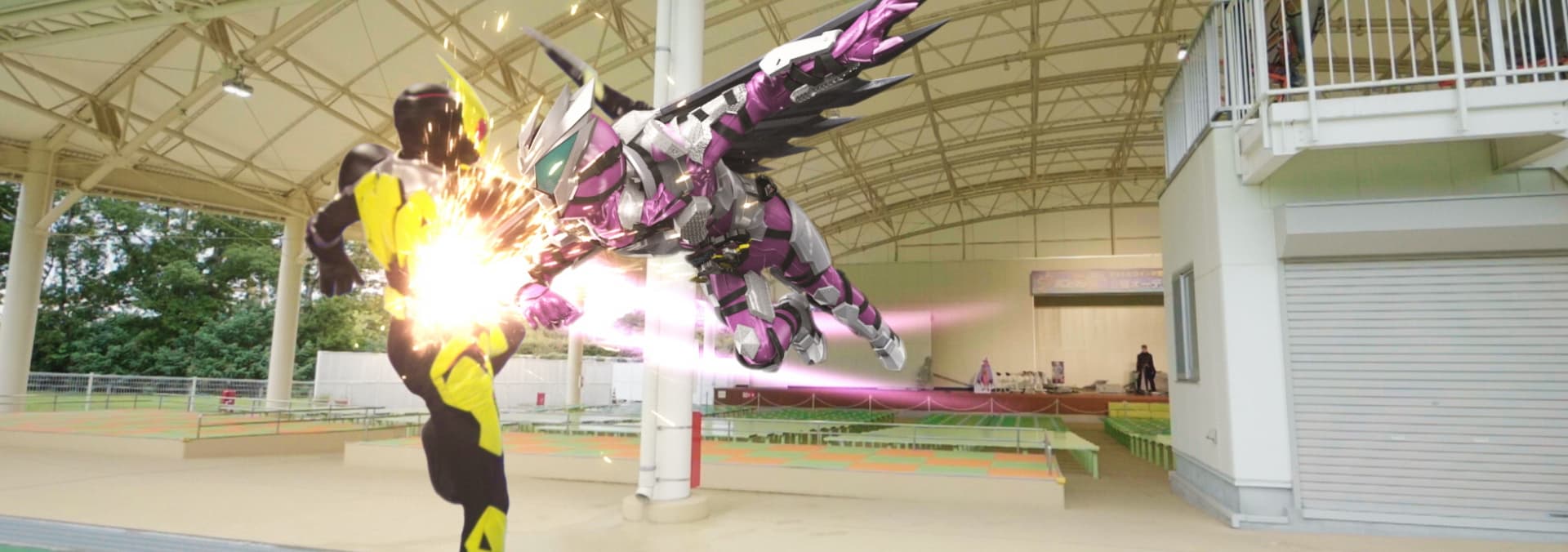 Transformed into the shining form called Shining Hopper, Zero-One confronts the Dodo Magia