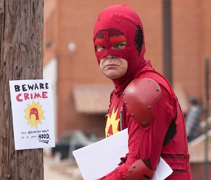 Su vida es deprimente, su esposa se va con un traficante de drogas y, en un momento de inspiración, se convierte en superhéroe, pero sin superpoderes.