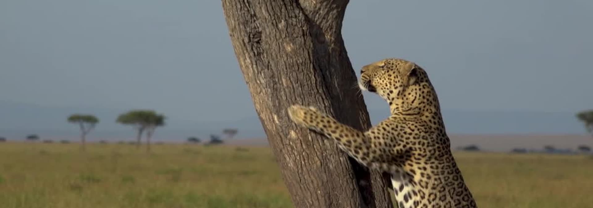 Leopardess Thandi and her 9-month old cub feed on a duiker kill in a quiet grove in Djuma. In Kenya, aging hyena matriarch Waffles must guard against an impending take-over.