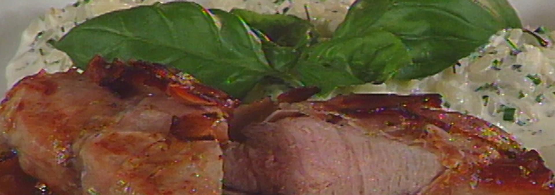 Recipes included with this episode: Summer Scallops Salad, Saddle of Veal on Morel Sauce with Herbed Risotto, and Praline Tart with Praline Ice Cream.
