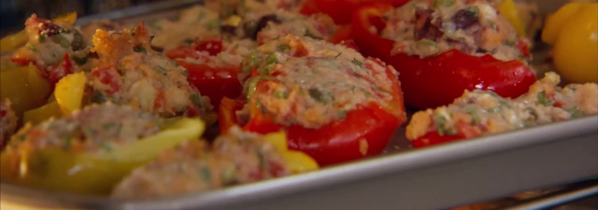 Halibut baked with mushrooms in a lemon and white wine sauce; stuffed peppers with capers and anchovies; anise cookies.