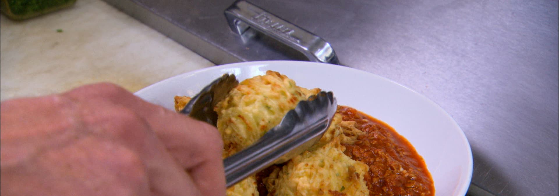 Host John Catucci fancy dresses beef franks, says “Sí, por favor”to the Macho Nacho Burger and accidentally discovers Meat & Spaghetti balls.