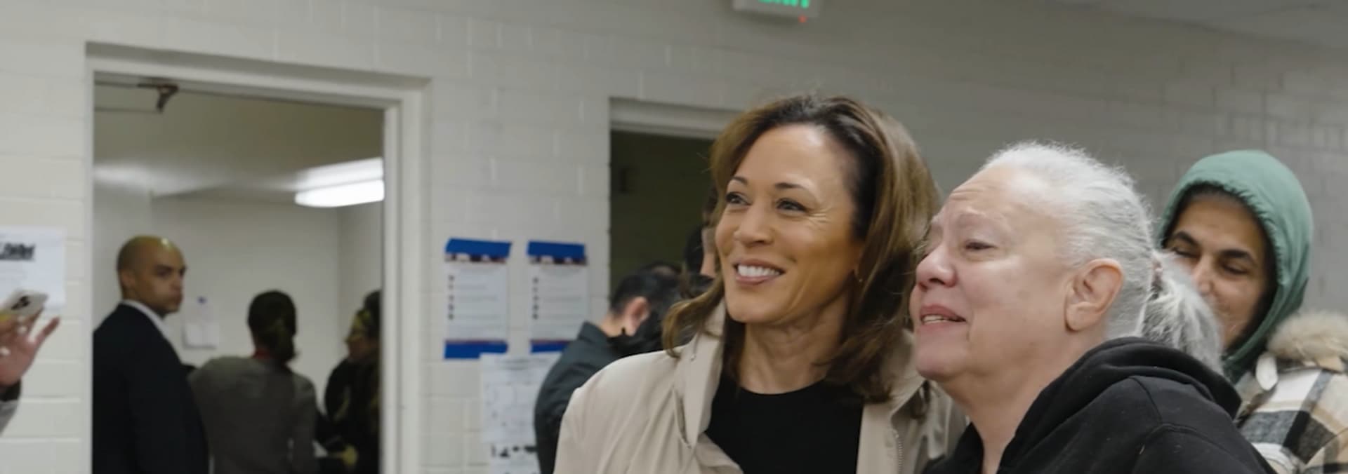 Former V.P. Kamala Harris surveys fire damage in the Palisades and visits the Westwood Recreation Center where evacuees are staying.