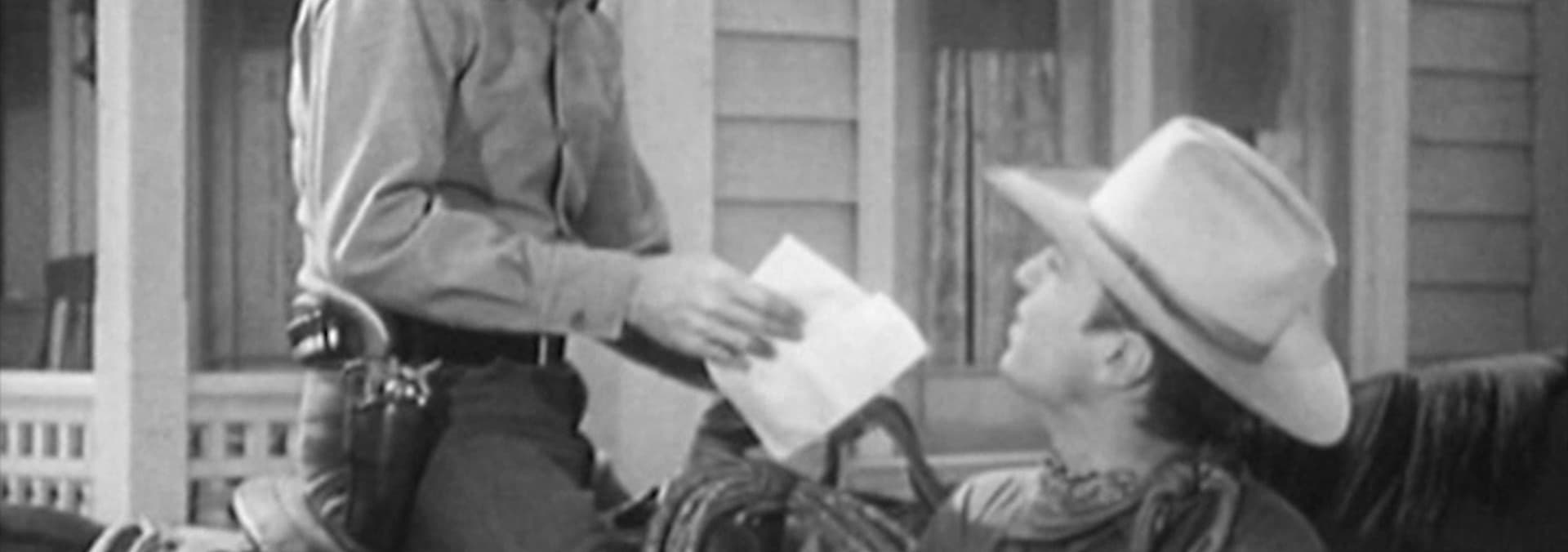 While pursuing an outlaw gang, Smith rides up to an abandoned house, hears a shot and sees a body come crashing through a second story window.