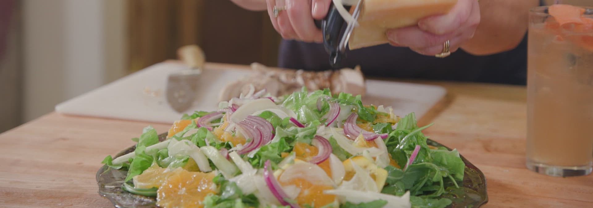 In this two-for-one episode, Rachael shows us a unique take on traditional pesto sauce with a base of herbs and charred onions that pairs with a Mediterranean chicken salad.