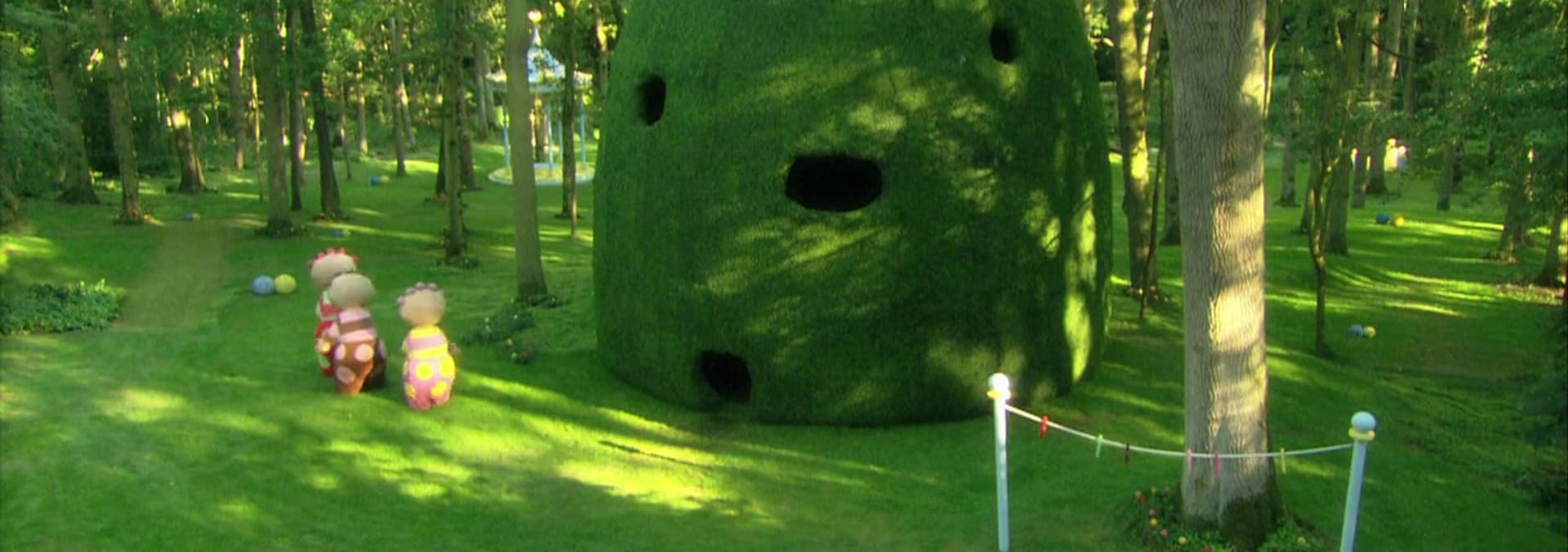 The Pontipines count to three. First the Tombliboos play hiding, then the Pontipines set off for a walk around the garden. As always, Mr and Mrs Pontipine lose the children. Which flowerpot are they hiding in the big one, small one or the one in between? The home time bell rings and Mr and Mrs Pontipine head back to the house. Meanwhile, the children go rolling home in the biggest flowerpot. Everybody joins in the dance at the gazebo.