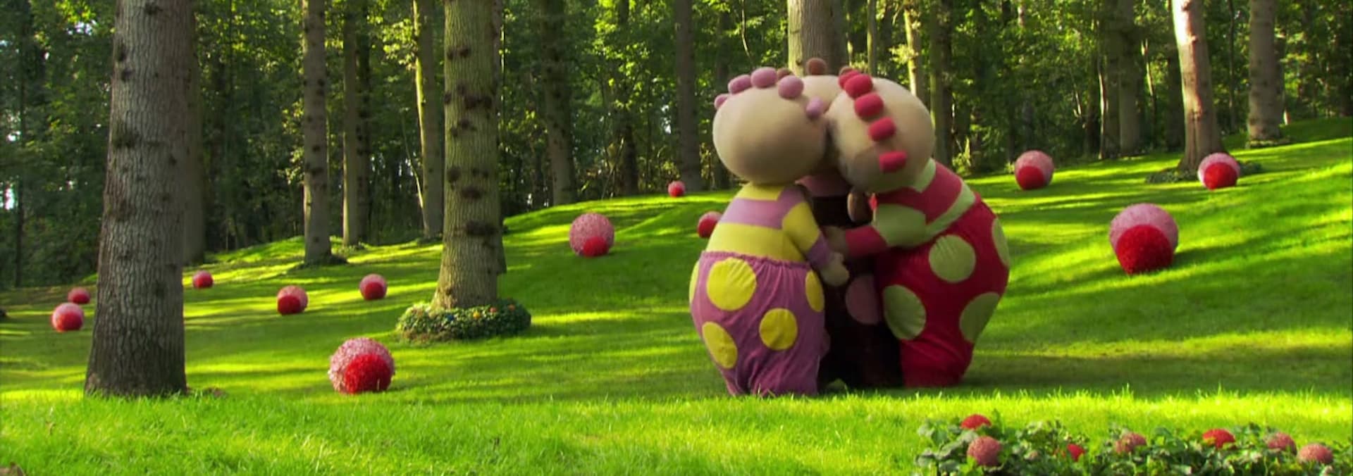 The Pontipines count to three. First the Tombliboos play hiding, then the Pontipines set off for a walk around the garden. As always, Mr and Mrs Pontipine lose the children. Which flowerpot are they hiding in the big one, small one or the one in between? The home time bell rings and Mr and Mrs Pontipine head back to the house. Meanwhile, the children go rolling home in the biggest flowerpot. Everybody joins in the dance at the gazebo.
