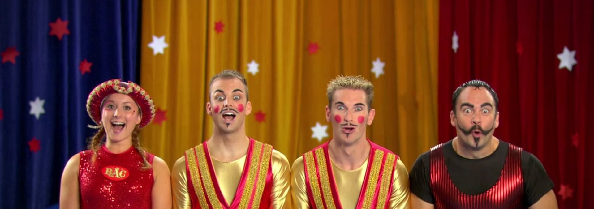 While the circus artists are dancing to some music they hear a noise, it is the circus children stretching! The circus artists want to do the splits and some stretching, but when they try they keep falling over