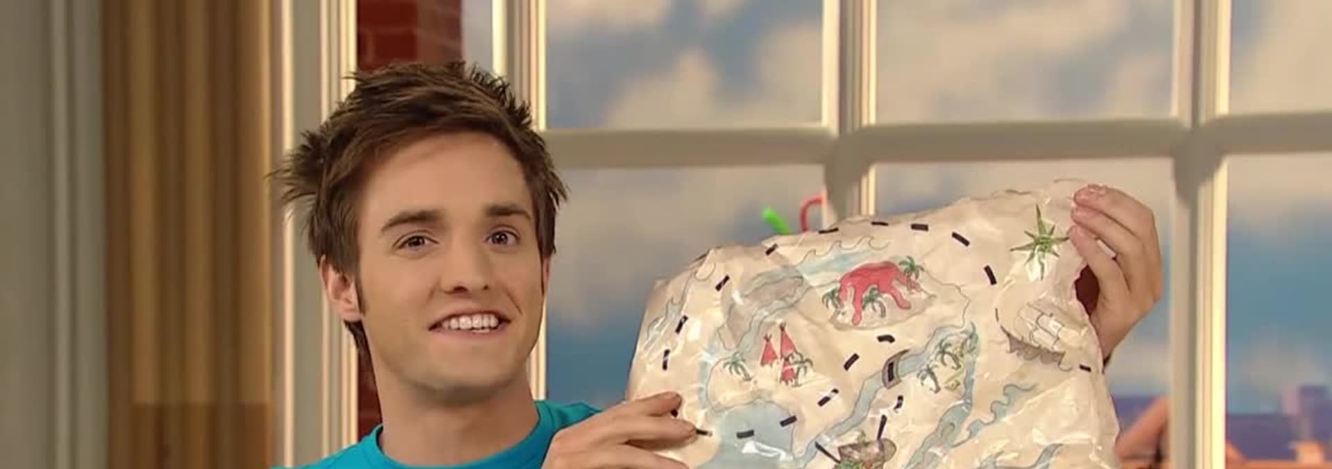 Jeremie shows how to make a treasure map look old, makes a cardboard flower from a picture collage, and creates a spinning top with a paintbrush and some cardboard.