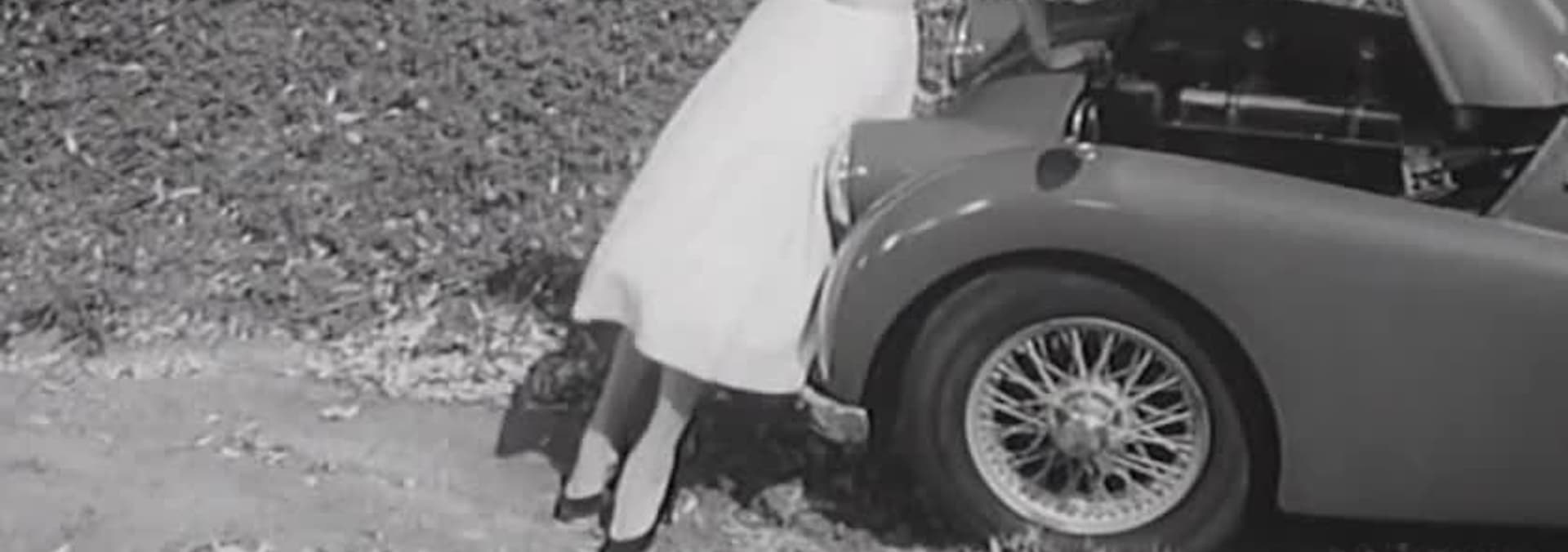A young man helps a beautiful, young woman who is stranded by the side of the road...her cars gas tank empty. He drives her to town to get gas and have a drink.