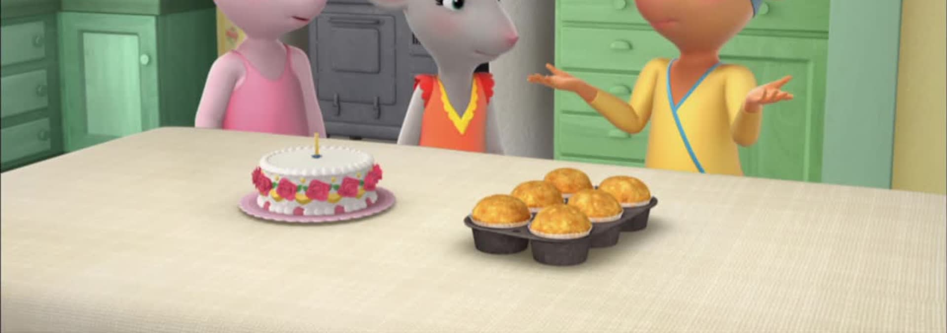 Angelina wants to give Ms. Mimi the best birthday ever! As hard as they try, all the party plans go comically wrong. They can't even buy a decent gift for their beloved teacher. They end up having a makeshift surprise party and Ms. Mimi is delighted. / Angelina loves her new Camembert Academy friends and also loves her old friend Alice. She is certain they will all become best friends and invites everyone to her home for a play date.
