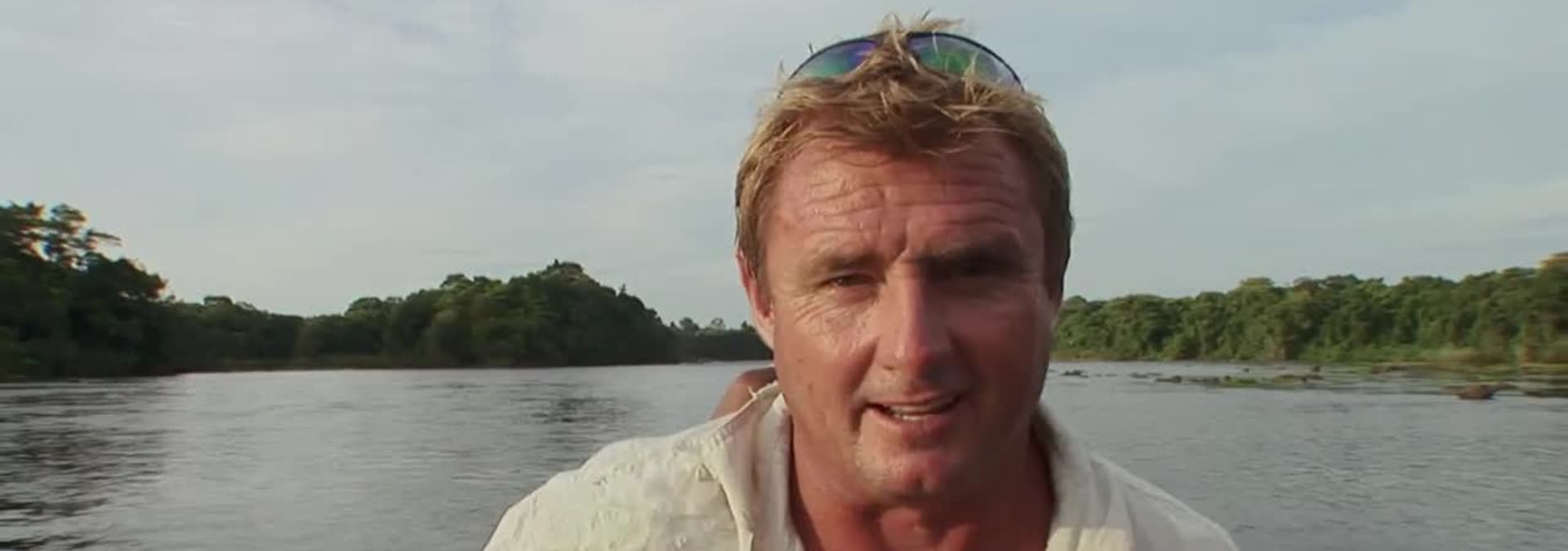 In the steamy jungle heat Steve and his guides explore the river in their dugout canoe.