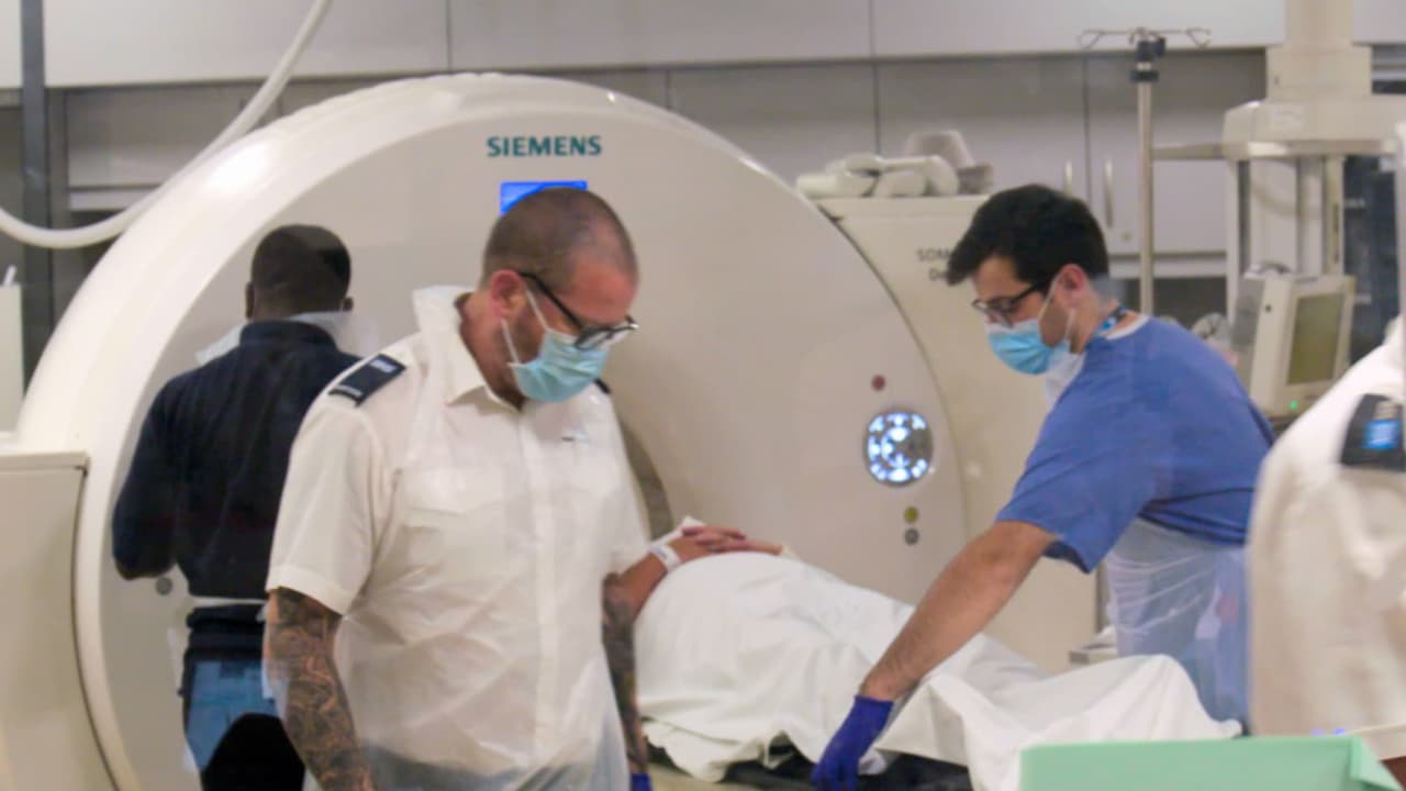 The A&E Department treats a man who fell through a glass window. A patient is escorted to the hospital by four police officers.