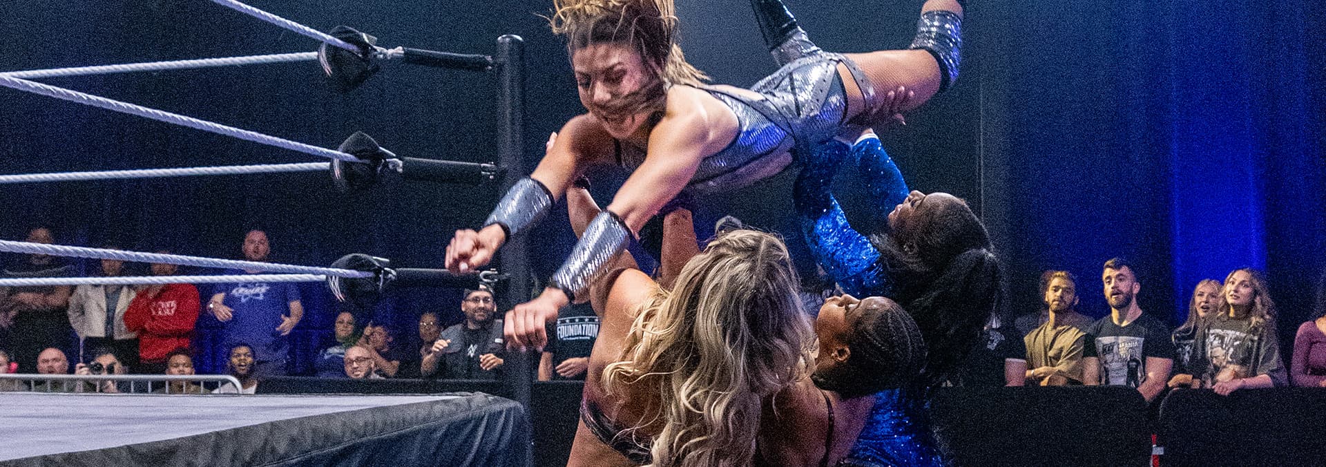 Natalya and Kali Armstrong arrive for their in-ring contract signing. The Vanity Project battle Cruz Del Toro, Joaquin Wilde and Lince Dorado.