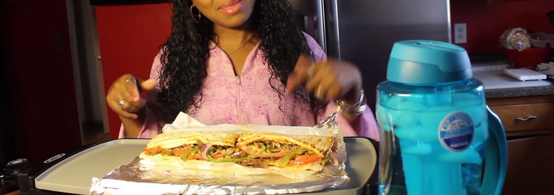 Blove feasts on Popeyes fried chicken.