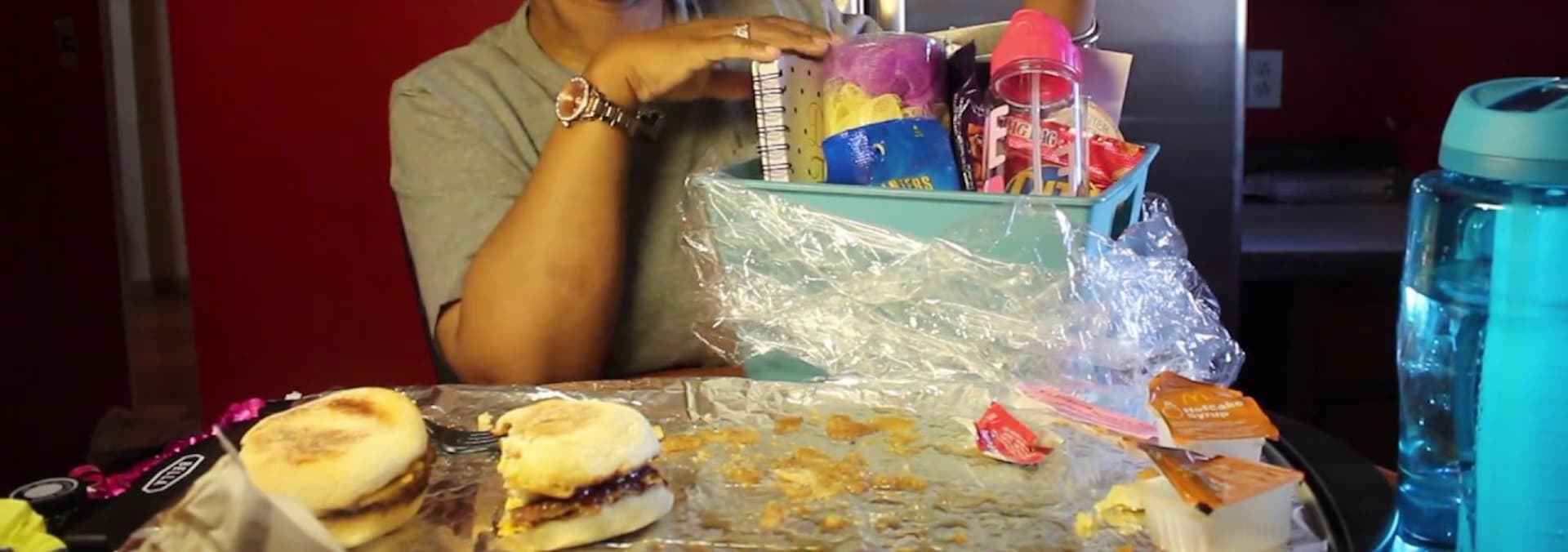 Blove feasts on Popeyes fried chicken.