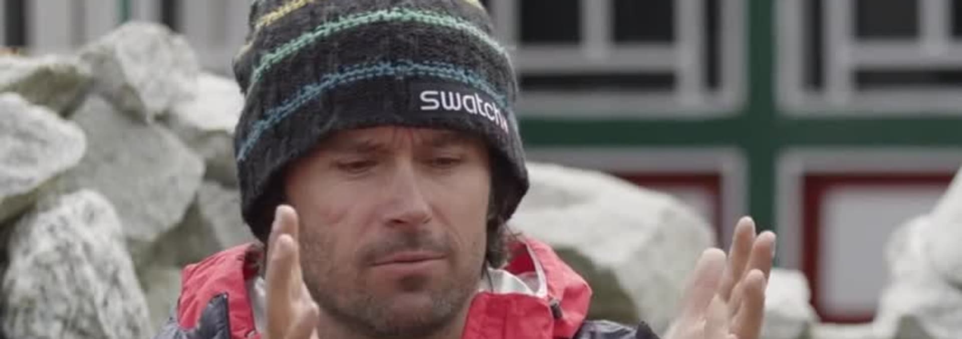 After being stopped on a risky ascent twice because of ice, Jeremy Jones attempts to traverse the face to a new route during the filming of Higher, his 2014 snowboard film.