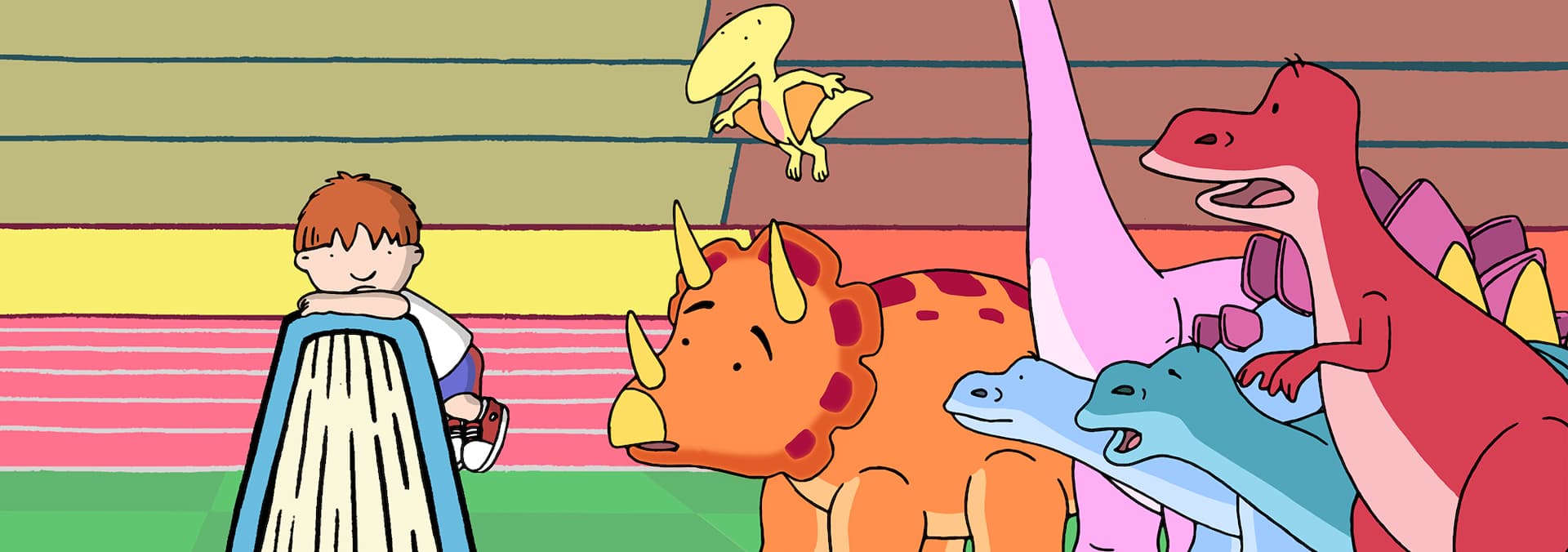 Harry is disappointed to find that he is not able to join in with any of the activities his family are taking part in at home, so he decides to go to Dino-world to invent his own clubs, which only himself and the dinosaurs can join - i.e. Bungee jumping, messy cooking… / When Harry is told to tidy his room he simply transfers all the mess into Dino-world, where he is told there is a 'no tidying up rule'. This results in chaos in Dino-World and Pterence ends up getting lost in all the rubbish causing Harry to tidy Dino-World - and his bedroom.
