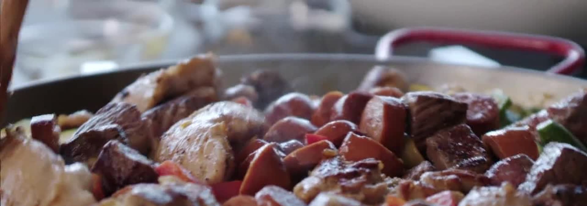 Bren cooks up a seafood paella and a meaty chicken, beef, and chorizo paella, both served with her father's famous sangria.