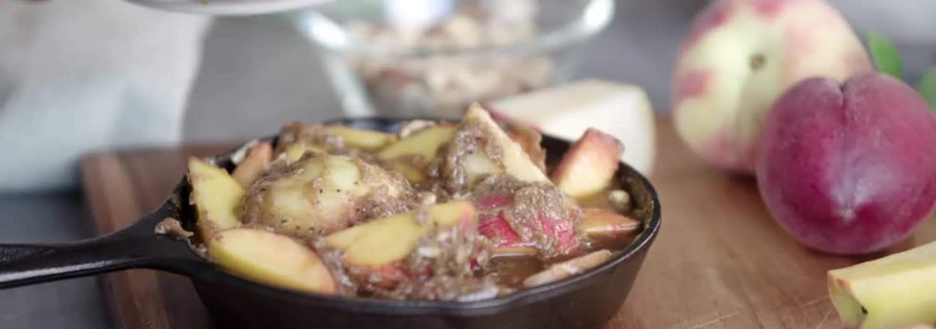 Bren cooks casarecce with basil pesto, tomatoes, and sirloin tips. For dessert, it's a peach skillet with tropical granola and coconut ice cream.