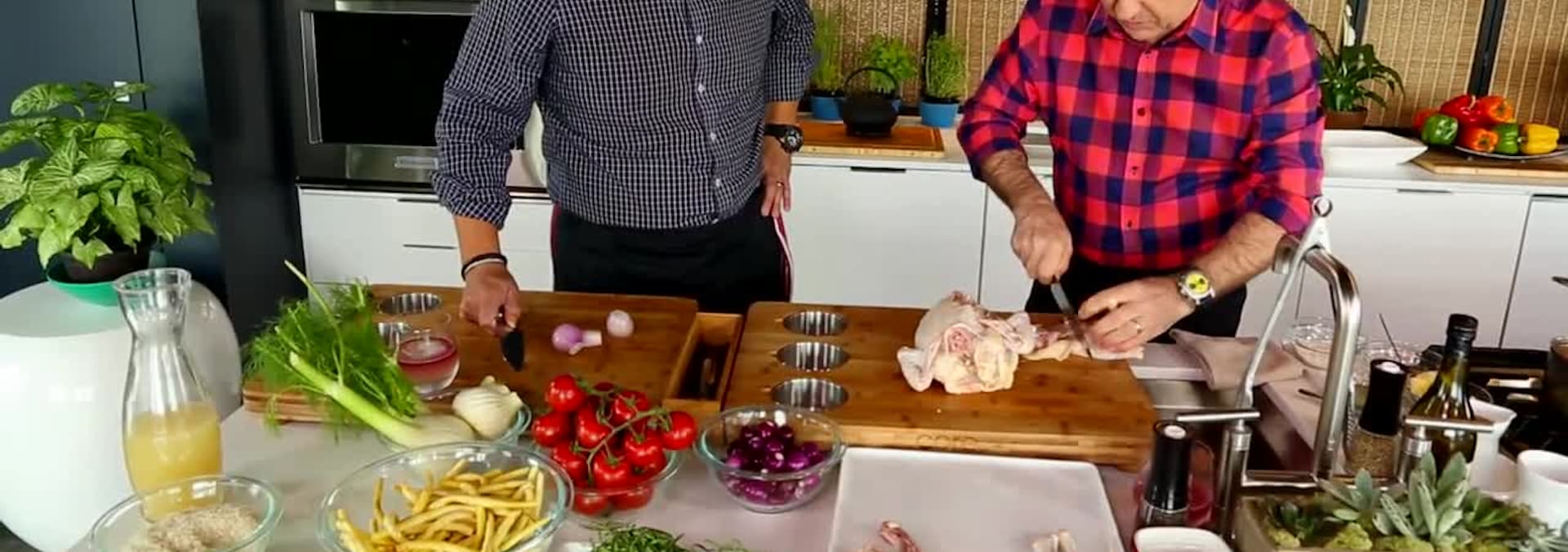 French chef Daniel Boulud stops by to create a classic French dish, Poulet A L'Estragon with Rice Pilaf and Yellow Wax Beans. Ming makes his favorite Chinese Five-Spice Split Chicken with Charred Chile-Tomato Salsa and Steamed Buns.