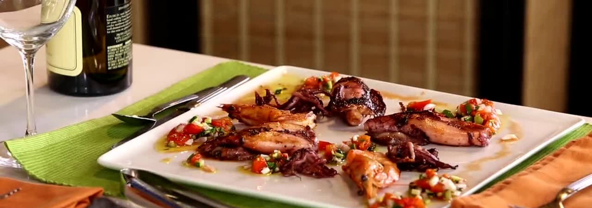 James Beard Award-winning chef Lidia Bastianich makes a savory Grilled Calamari and Shrimp with Salsa Verde and Grilled Bread, which Ming matches with Blue Ginger Crispy Calamari and Thai-Lime Dipping Sauce. It's the best of frutti di mare!