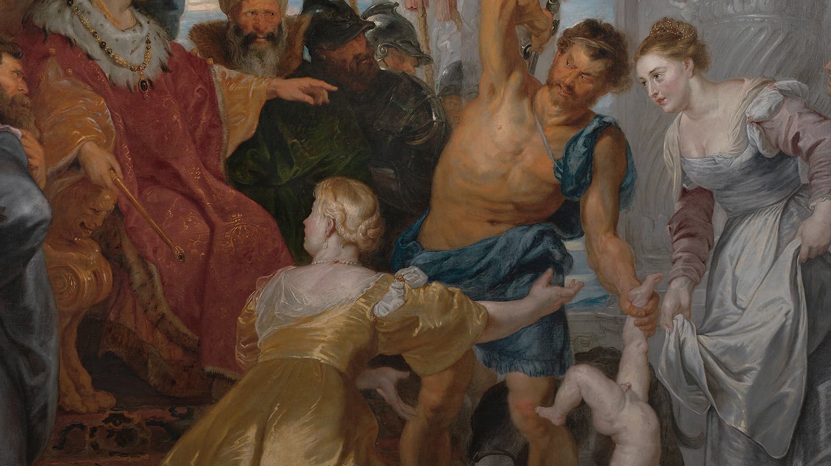 Moses is found in a basket in a river by Pharao's daughter.