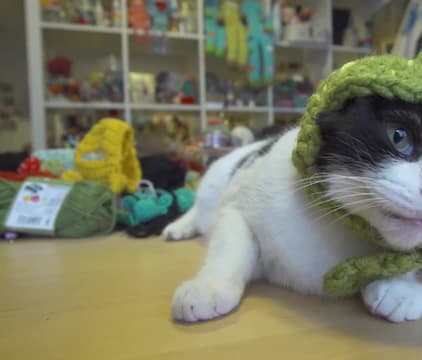 A cat tries on an assortment of knitted hats. Another cat who lives with a famous comic book artist has his own socks designed after him. A third cat has his own picture around his neck.