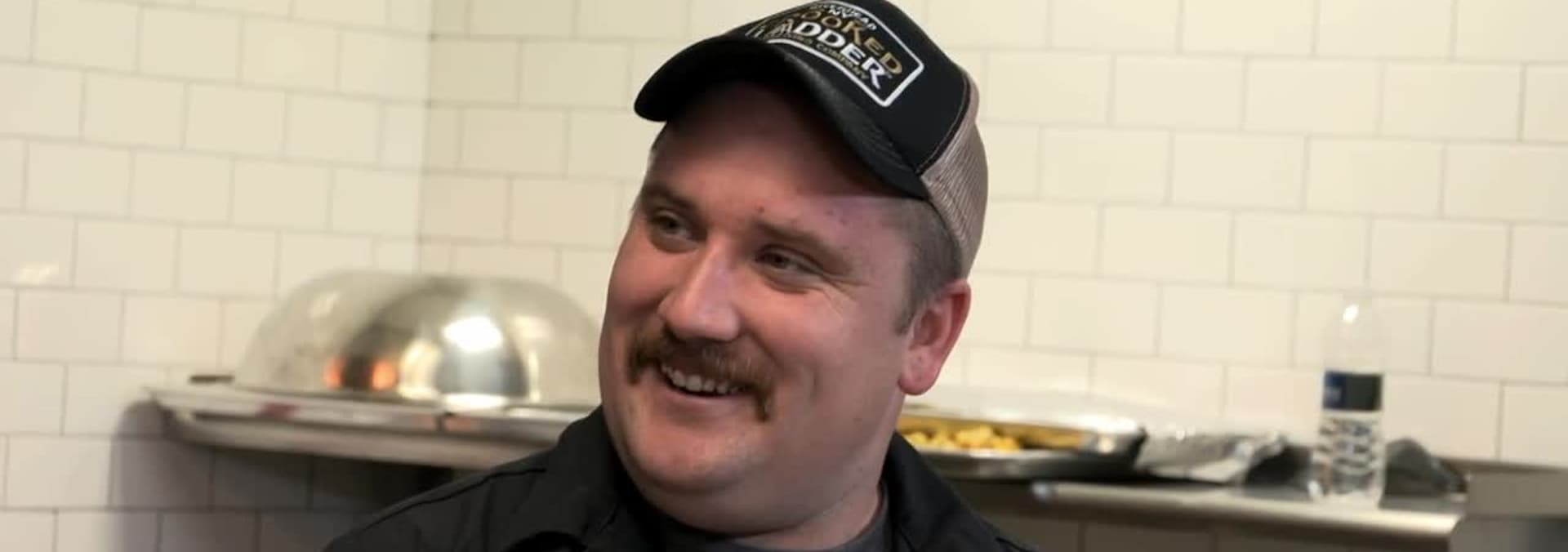 Ray makes food for homeless veterans at the Northport Fire Department’s Heroes Night Out charity and interviews its founder. Brownies by Genie.