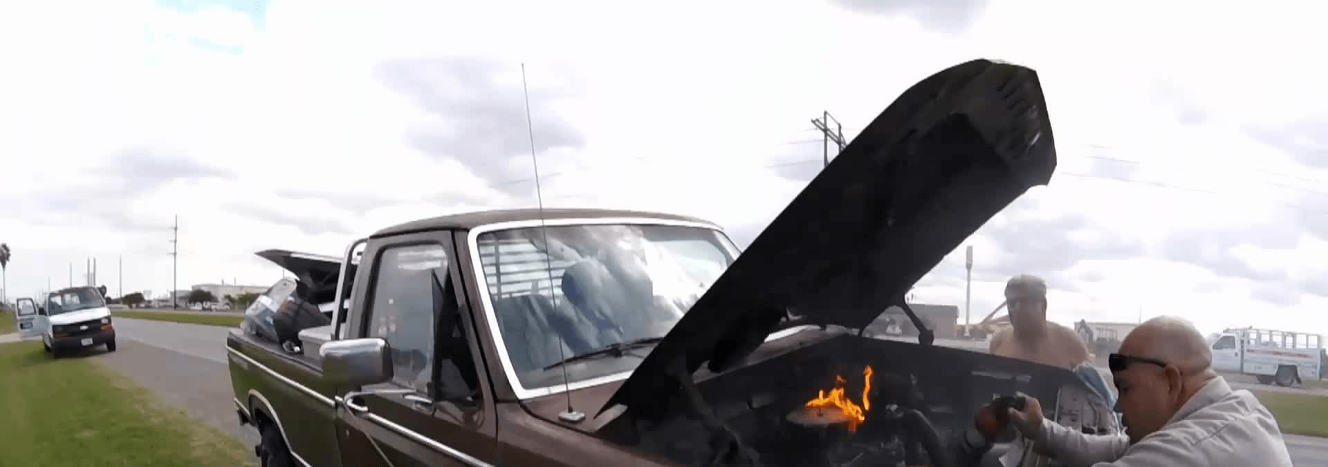 A tractor runs amok in a parking lot, a truck travels by hot air balloon, and a chef uses only a motorcycle to prepare dinner..