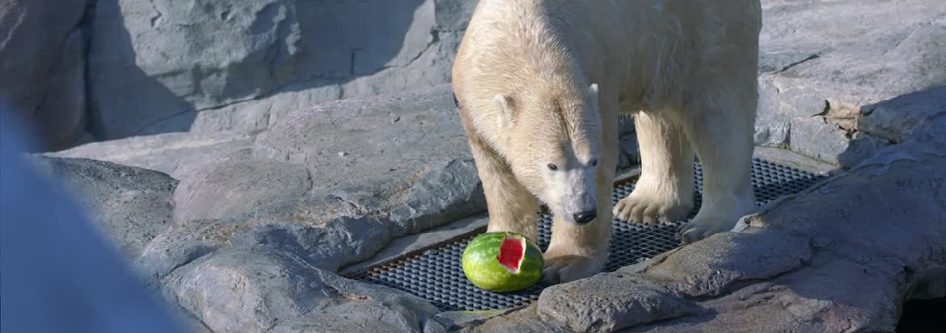 Team treats a rescued polar bear's injured paw and handles conflicts involving a male polar bear; a movie wolf shows appetite issues.