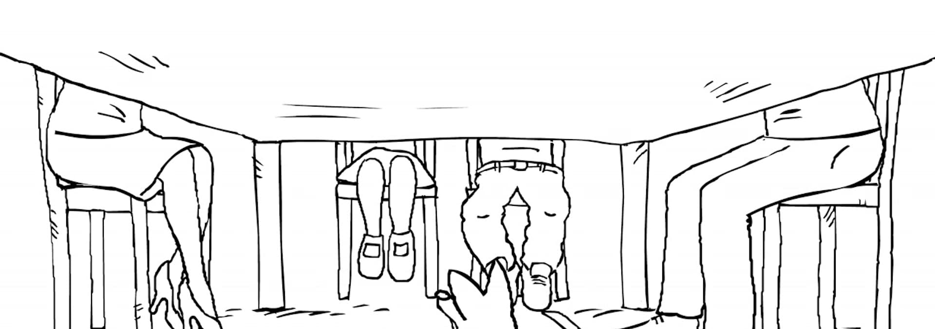 A lesson in over-consumption goes to an eagerly overeating dog and the family as they drop scraps to eat at the dinner table.