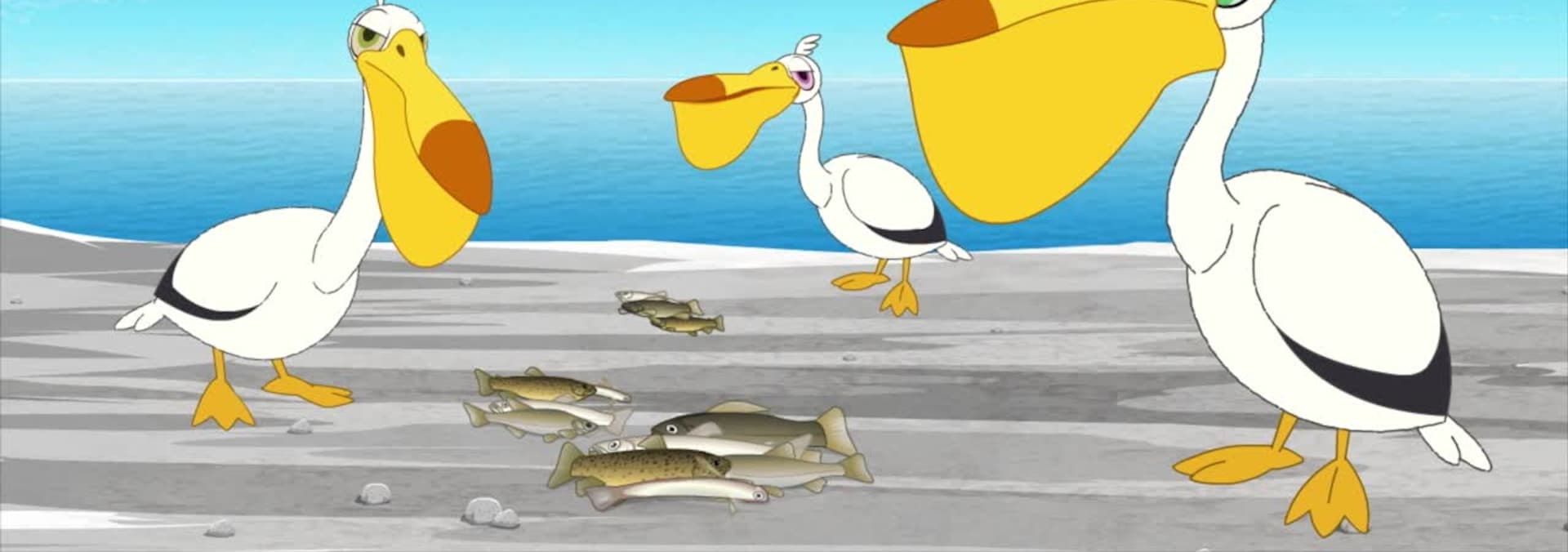 This is Banc d’Arguin National Park, Mauritanie, East Africa. YooHoo and friends were traveling across the sky on a tree leaf hand glider when they meet a group of pelicans. Roodee cannot resist but to laugh at the unusually small one with a small beak. He accidentally spills all the fish the poor lump-beak pelican caught with its little beak.