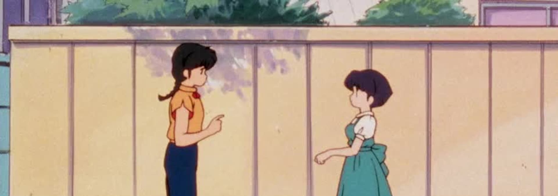 Stuck in the middle of a fight between Ranma and Ryoga, Akane's long hair is chopped off by Ryoga's bandana sword.
