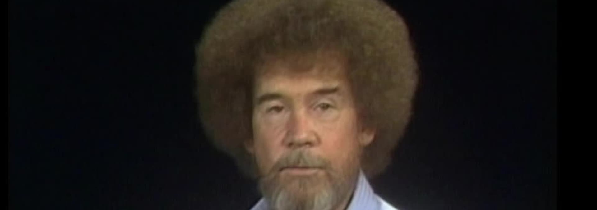 La artista invitada Dana Jester crea una escena de montaña al estilo de Bob Ross, con estribaciones y árboles de hoja perenne, y arbustos