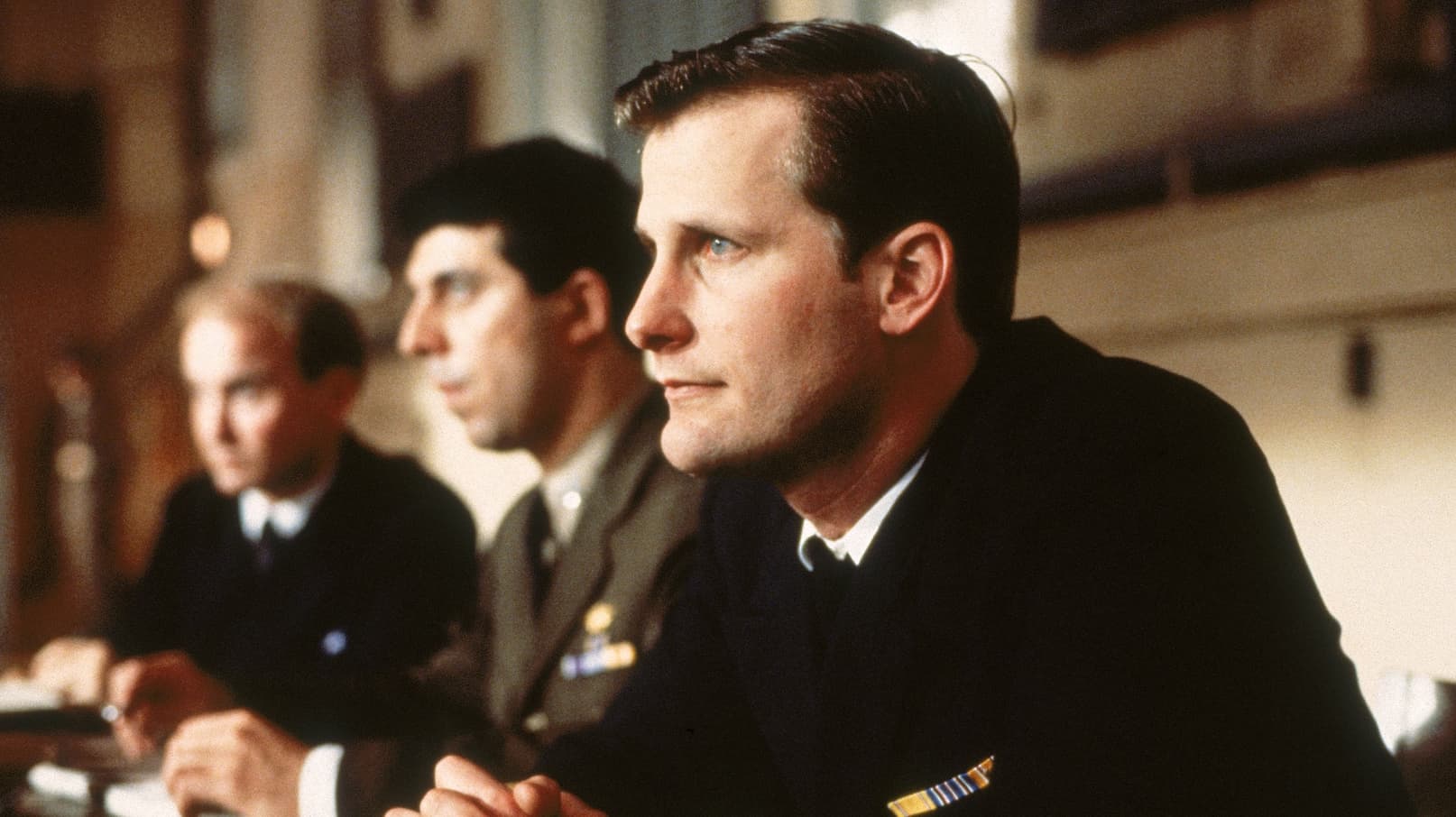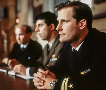 In this courtroom drama, witnesses take the stand in the trial of a young naval lieutenant who relieved his captain of command during a violent storm.