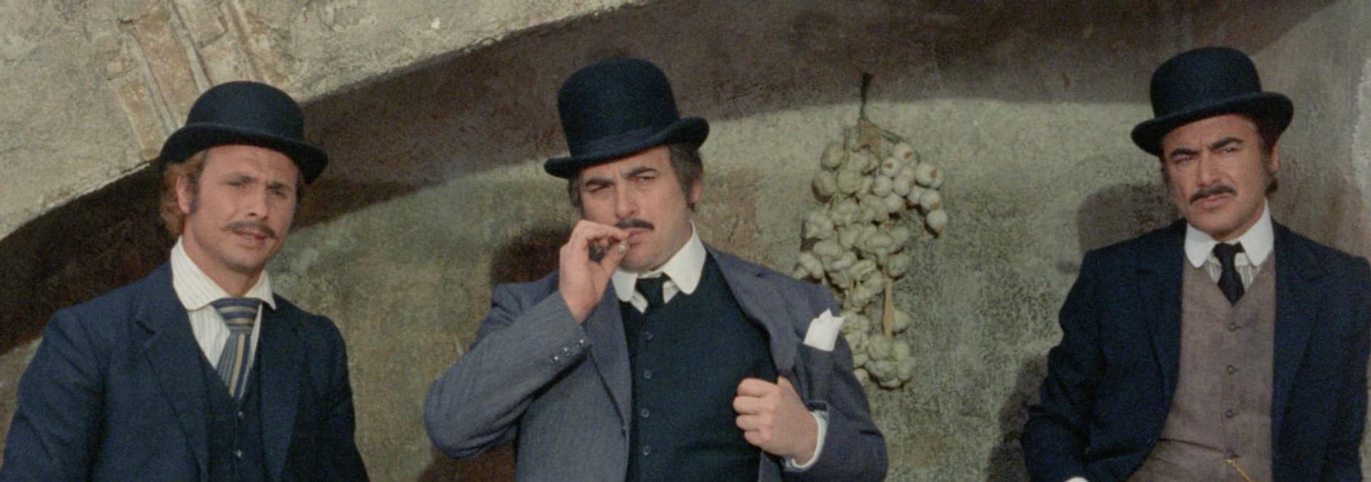 A cowardly man is considered a tough guy in the neighborhood after putting on his late brother's bowler hat, which gives him courage and strength.
