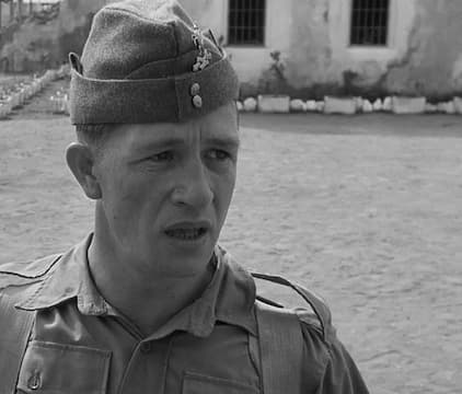 In WWII, a defiant POW resists abuse from a brutal guard in a desert military stockade, showcasing an indomitable spirit amidst harsh confinement.
