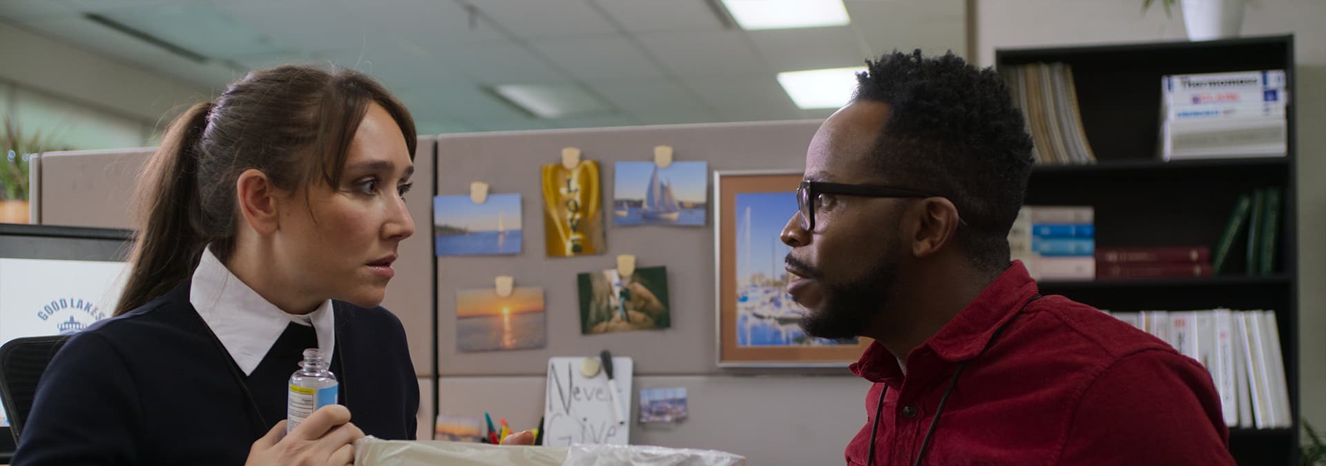 A corporate flunky faces deadly consequences after telling a small lie to her eccentric coworker Larry in a bid for promotion at work.