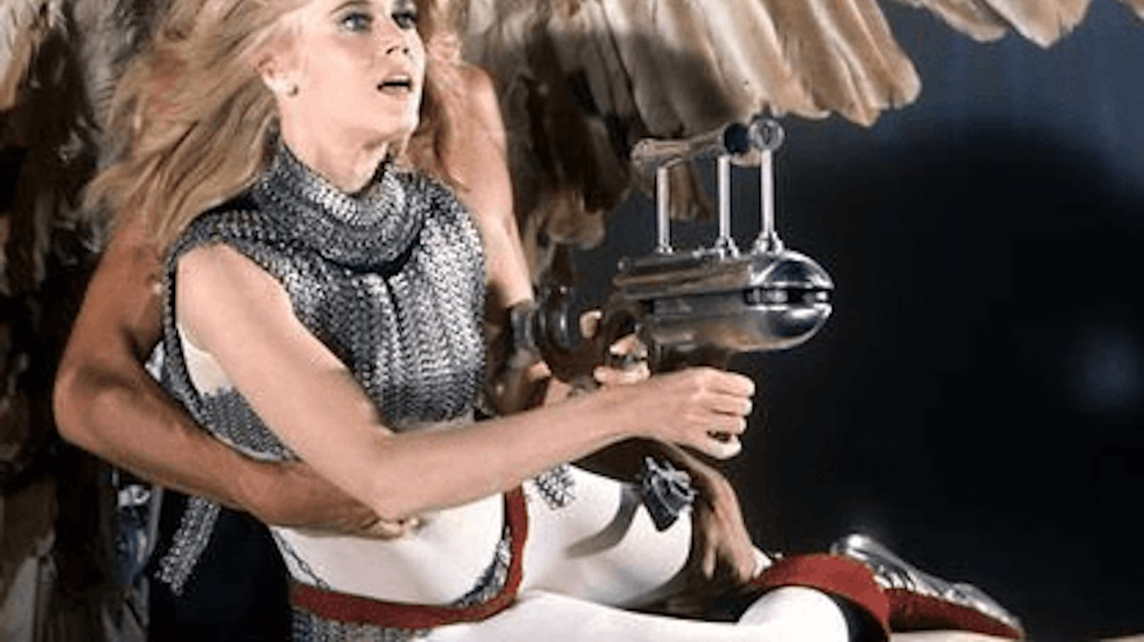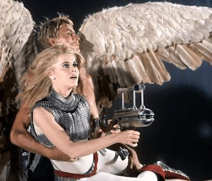 The setting is the planet Lythion in the year 40,000, when Barbarella makes a forced landing while traveling through space. She vanquishes evil in the forms of robots and monsters. She also rewards the handsome men who assist her in the adventure.