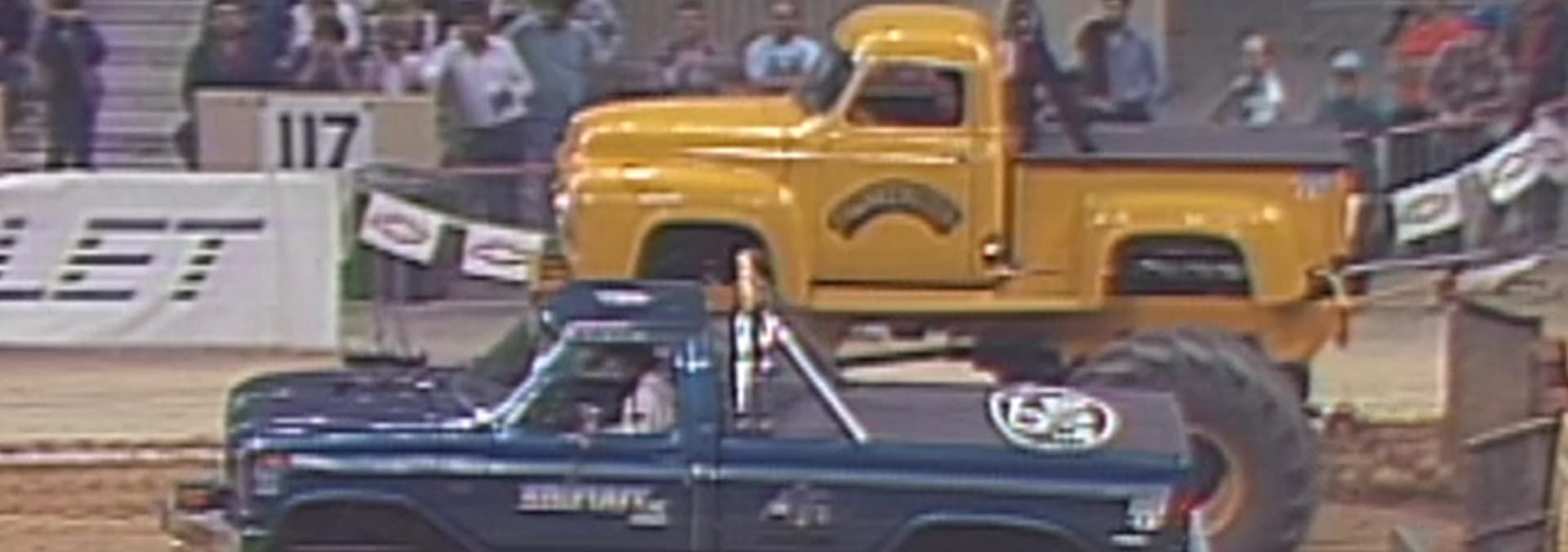 A spectacular, old-school collection of close-up crash race derbies, mini-Monster trucks, Monster trucks racing on water and crushing a mobile home.