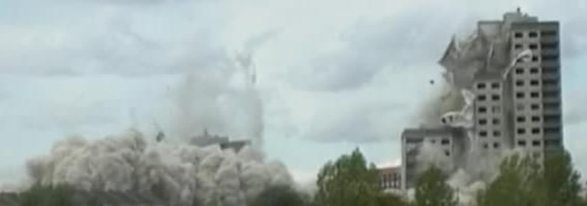 A fascinating view of hotels turning to rubble, apartment buildings disappearing into the sky, and water towers crashing to the ground.