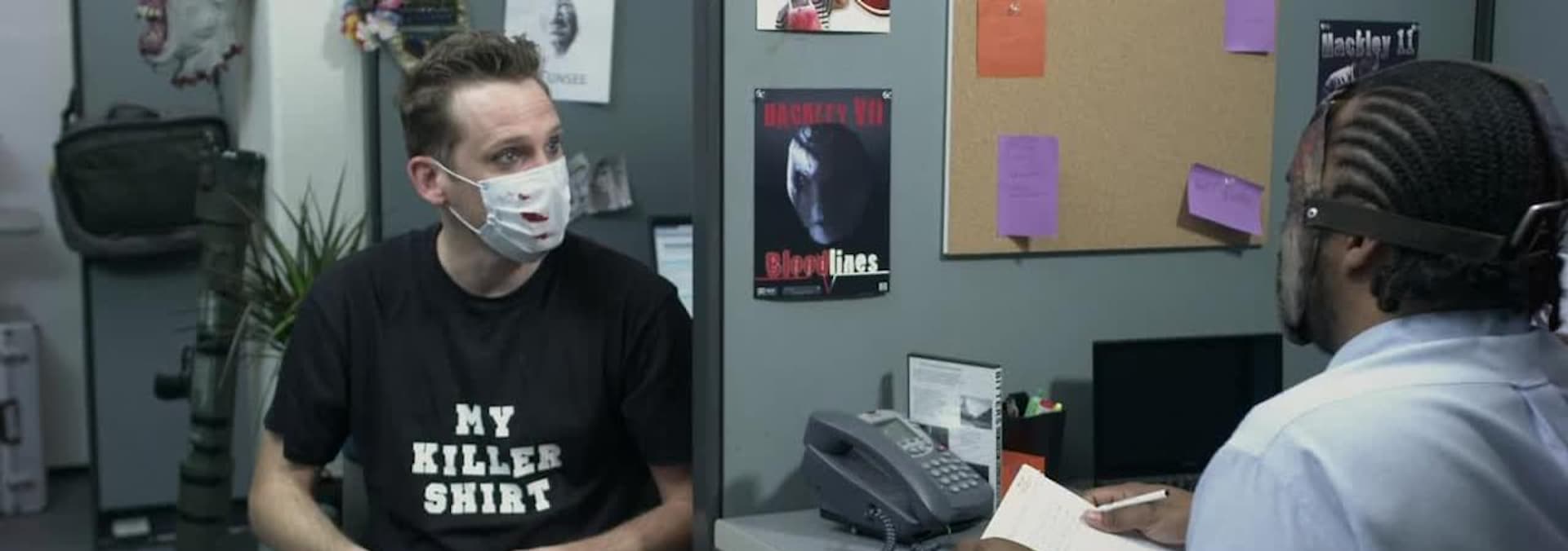 In this genre parody, a masked slasher struggles in a modern cube-farm office, with an incompetent manager, rival slashers, and overbearing rules.
