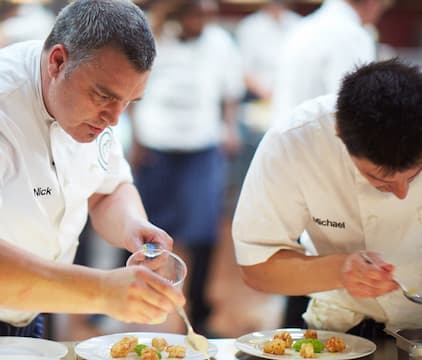 Two teams of 3 Contestant Chefs each prepare a 3 course meal for 120 guests.